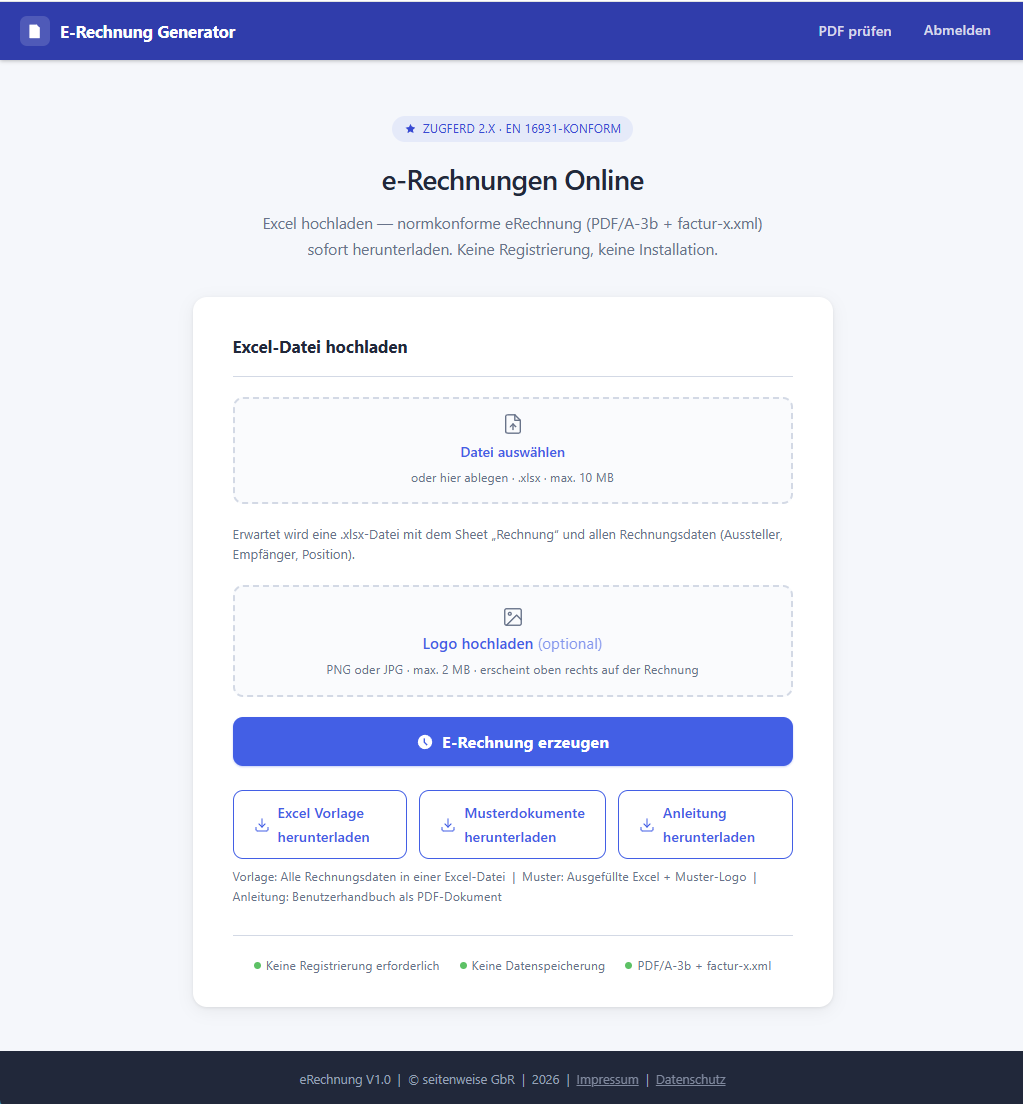 Excel auf die Webseite hochladen, auf „E-Rechnung erzeugen“ klicken — fertig in Sekunden.